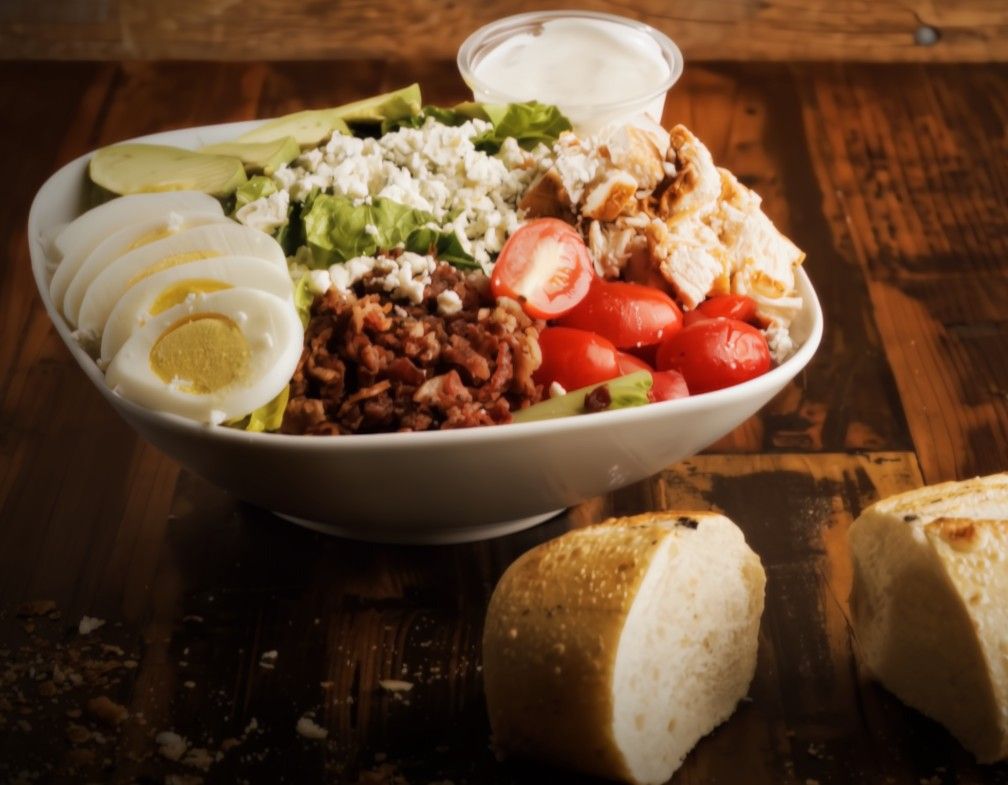 Romaine lettuce, grilled chicken, diced crisp bacon, egg, avocado, tomatoes, blue cheese. Served with blue cheese dressing.